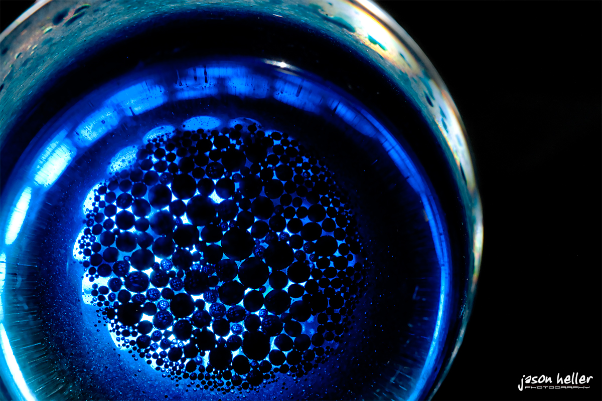 So here’s the back story – I was going to create a macro image of color infusing into a viscus substance, but the base oil was too thick and the food coloring didn’t mix at all. As I watched the color bead up at the bottom of the glass, I created a small set to shoot it. The result is this abstract image full of concentric and non-concentric circles, and shades of blue.
